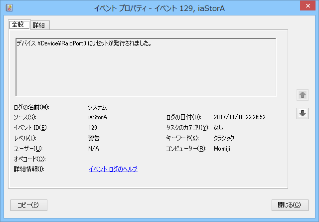 すると「デバイス \Device\RaidPort0 にリセットが発行されました。」というエラーが出ていた。