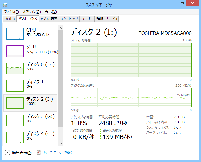 ディスクのアクティブ時間は100%だが、コピー速度は数百KBから0バイトを行ったり来たり…。