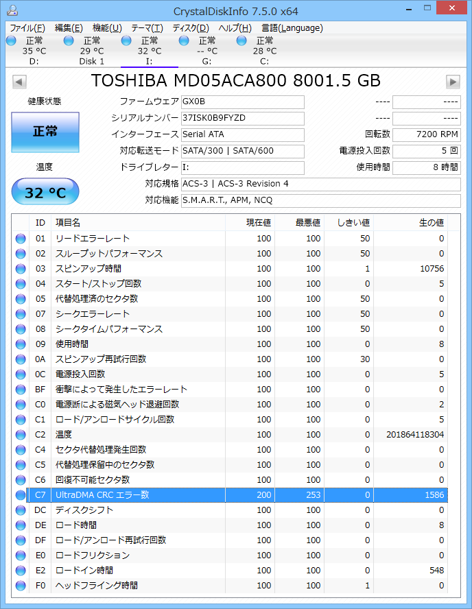 すると真っ先に目に入ったのが「UltraDMA CRC エラー数」が大きな値になっていた。