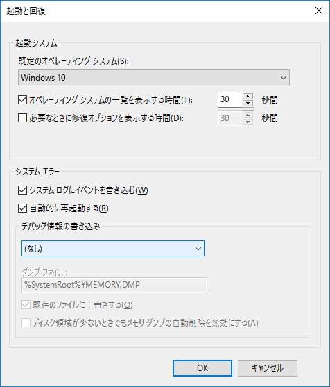 「詳細設定」タブ→「起動と回復」の「デバッグ情報の書き込み」を「なし」にします。