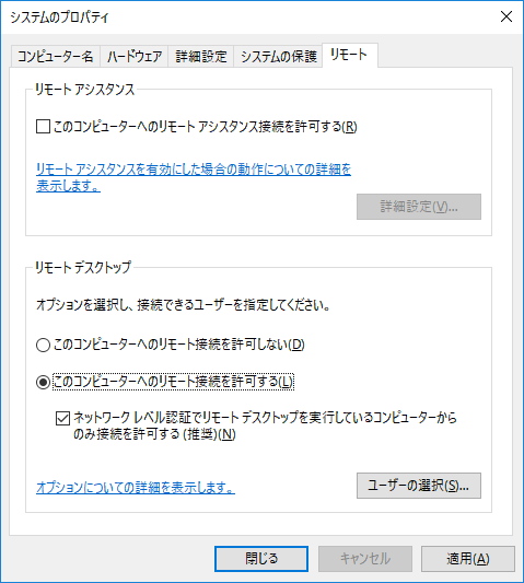 Pro版の場合、リモートデスクトップ接続を使う場合は「このコンピューターへのリモート接続を許可する」にチェックを入れます。