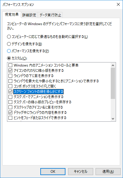 「パフォーマンスを優先する」を選択して、以下の項目だけチェックを付けます。