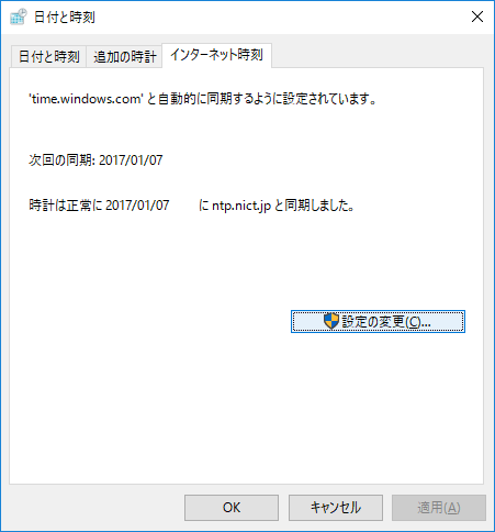 標準設定の「time.windows.com」は全世界からアクセスが殺到しているため頻繁に同期に失敗します。