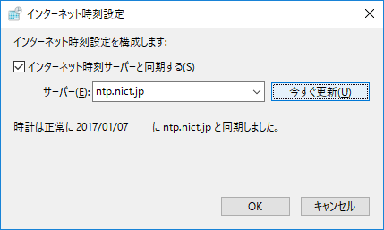 (3) サーバーに「ntp.nict.jp」を入力して、「今すぐ更新」を押します。